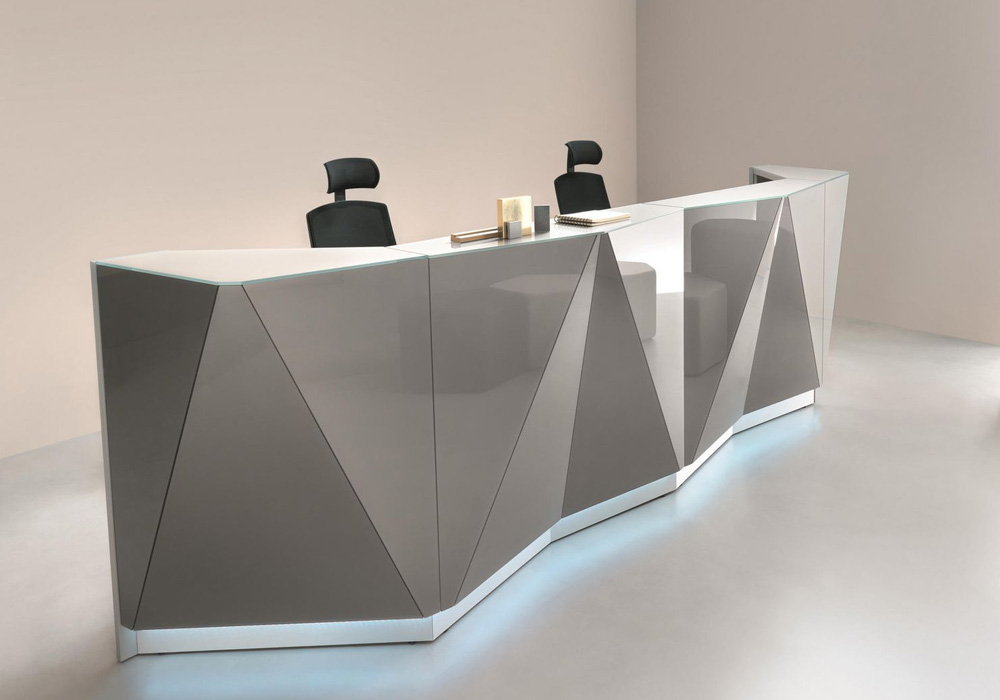 The Alpa reception desks present a form inspired by the majestic mountain range. It’s a very distinctive series simultaneously classical and luxurious. The material is a combination of glass, aluminium and high gloss laminates which come in a variety of colors.