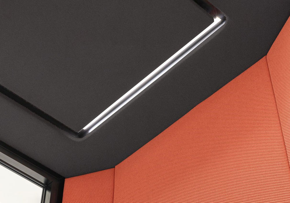 External lights signal the booth's availability; they are red when someone is inside. They can be turned on and off via a control panel that is also connected to the systems of interior ventilation and lighting. The user can adjust the strength of the fan and the brightness of the light to suit their needs. The quiet ventilators do not interfere with conversation or concentration, and the steel construction blends harmoniously with the sound-absorbing glass and upholstered elements. As a result, the Coda will work perfectly even in dynamic, noisy, and lively interiors.