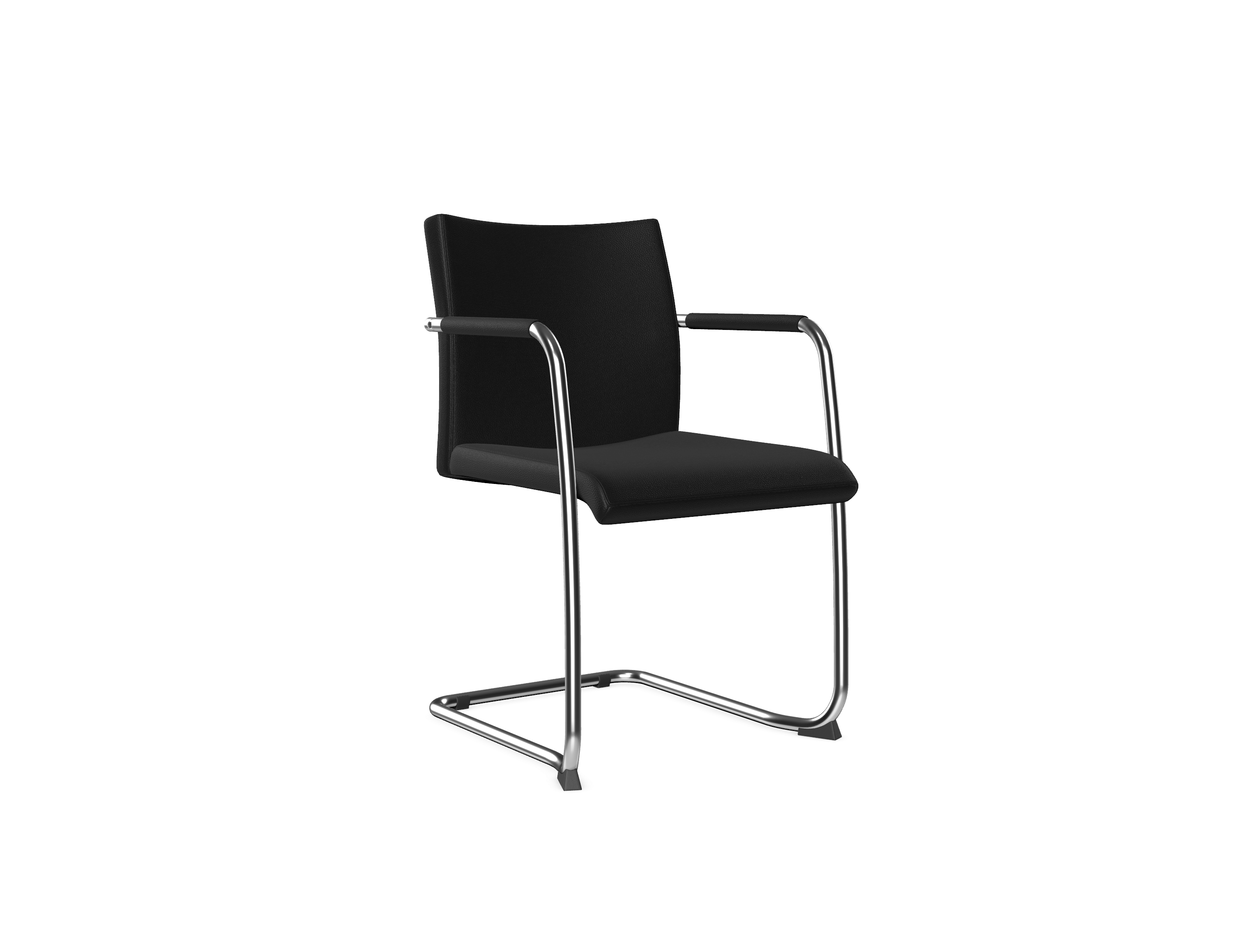 Conference chairs with a high or low backrest, on a frame made of a spring pipe that allows the armchairs to tilt slightly. Standard equipped with armrests covered with an upholstered pad. Their simple appearance makes them suitable for various styles and types of interior. The standard metal frame is powder coated and is also available in chrome. Each version can be stored vertically.