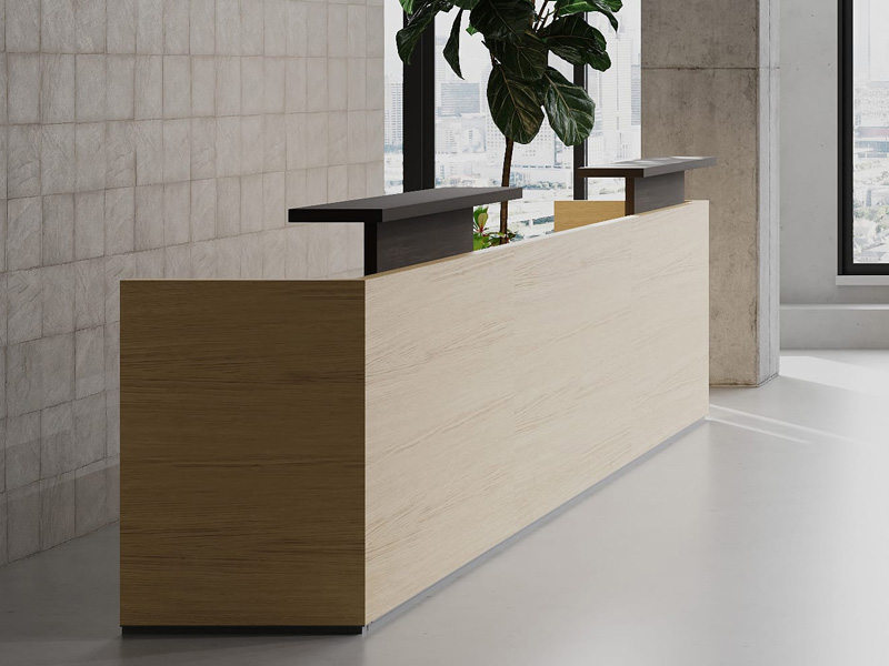 Furonto reception counters offer a wide selection of sizes, shapes, and finishes, from melamine panels, to matte and glossy lacquered surfaces, natural wood veneers with special textures, and fronts covered with glass panels or sheets that imitate concrete. The desk fronts are available in two height options: straight, corner, or curved. The desktops come in two depths and are designed in shapes tailored to the furniture front line. This wide selection of basic system elements allows for flexible and adaptable reception space arrangements according to individual needs.