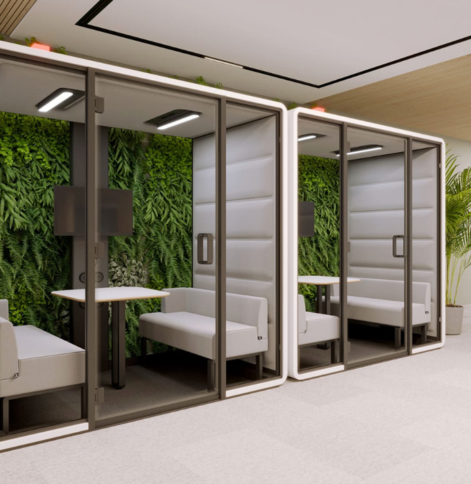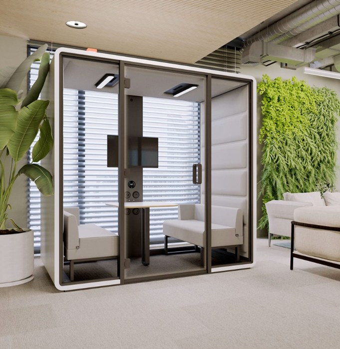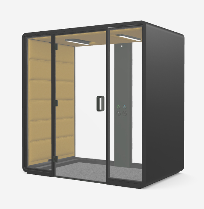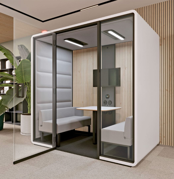 HushFree.Access.M is an office pod, fully adapted to the needs of people with mobility disabilities. The pod has a low threshold, enabling easy and relaxed entry, a wider door, and a handle allowing easy booth opening, and easy access to the pod – just pull them towards yourself, without the need to turn your wrist. The pod door can be left or right-handed, which additionally allows you to adapt the booth to the needs of the employees of a specific office. HushFree.Access.M has a new LED lighting system with an intensity of 500 lux at the tabletop level. The booth will enable you to spend much more time on meetings and conversations, whether stationary or online, while maintaining peace. The pod is intended for face-to-face or hybrid, meaningful conversations requiring privacy, team meetings, or creative work. It is also perfect as a small, private workspace or office. You can equip the booth however you want – arrange its interior yourself.
