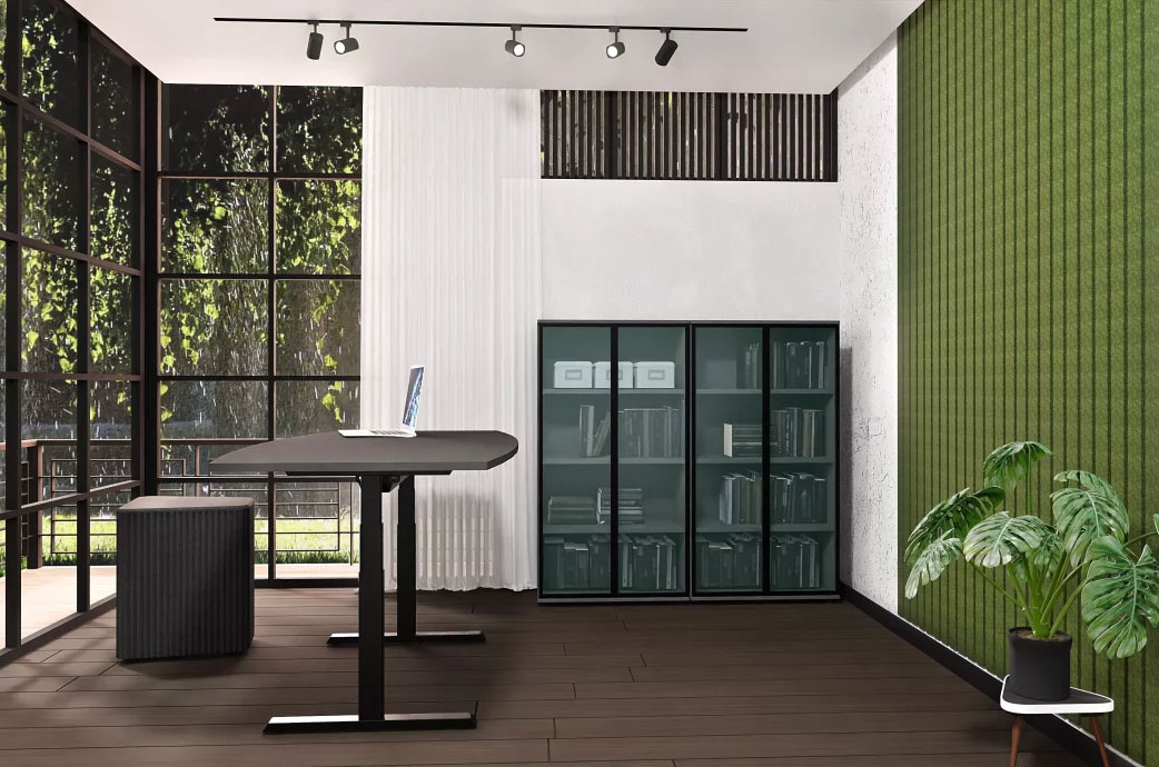 The L-Line E desk can be fully customized to your needs. Thanks to availability of many accessories such as acoustic panels, media ports, CPU holders, or optional chrome feet, you can create the perfect ergonomic workstation.