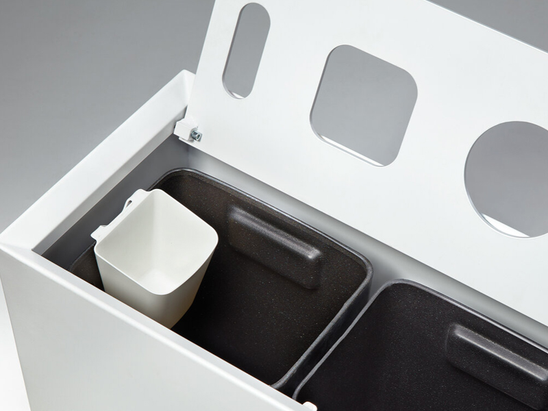 Zell is made from1.5 mm sheet metal, unified by welding. The hinged lid is attached to the trash can body with 2 non visible screws. 40 liter plastic inner trays (ZUR 50) are included. Base has rubber blocks to protect the surface where it is located. Vinyl residue indicator icon. The version with hinged doors, incorporates ring to hold the bag.