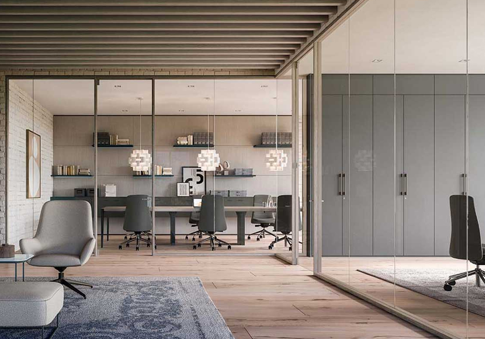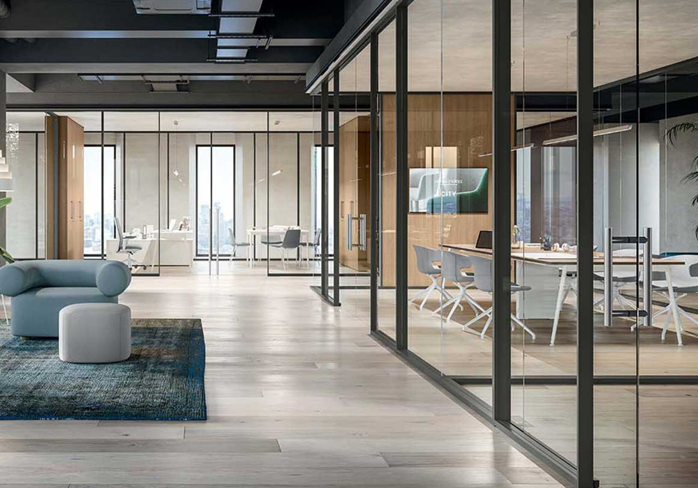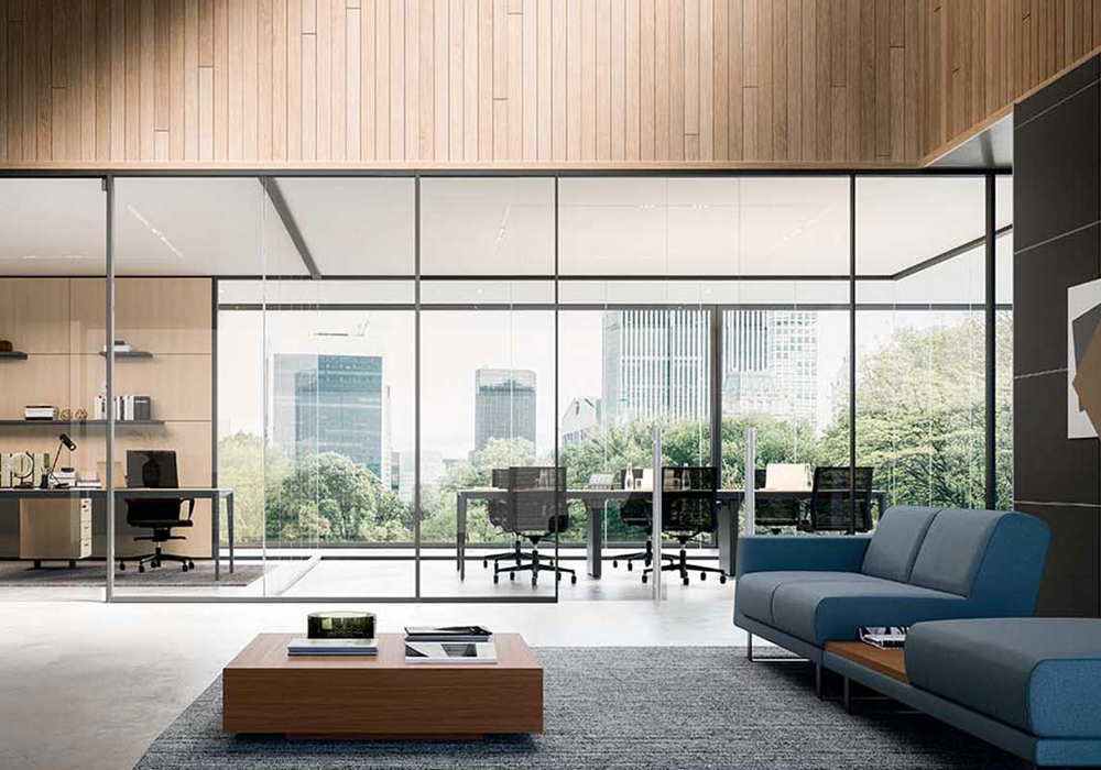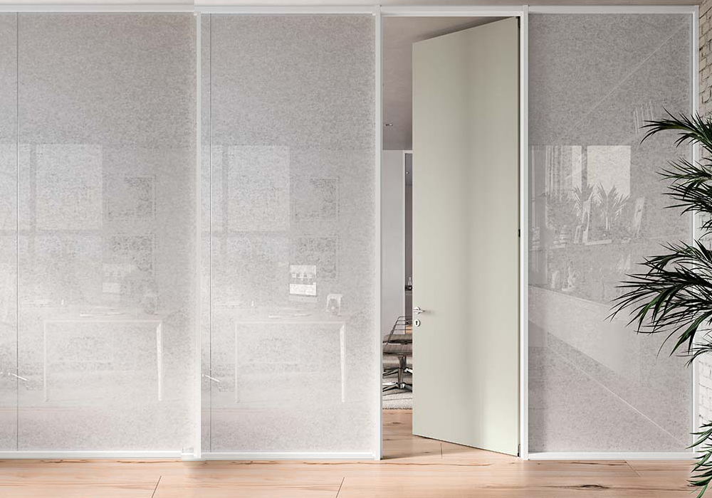 M1 integrates with all the blind walls of the XW system, to create operational and executive spaces, open spaces and meeting rooms, thanks to its versatile nature.