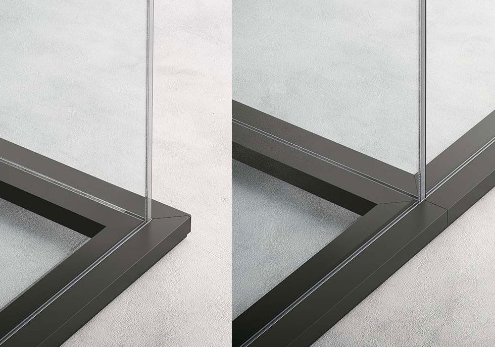 The horizontal and vertical profiles making up frameless partitions are in 1.5mm thick extruded aluminium with a variety of sections. They are anodised and can be painted on demand. All profiles come with hermetic seals that prevent dust