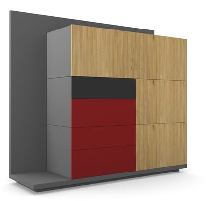 The SORENO collection is a remarkable variation on the classic form of office furniture. A thick, solid desk top gives the impression of being supported on one side only. In fact, it rests on the sheet of strong, tempered glass that runs through almost all its length. The solution intrigues and at the same time gives the furniture a light touch. The collection is complemented by simple cabinets and tables, giving great space arrangement possibilities. The desk top, alike table tops and cabinet fronts, are finished with a natural veneer. In addition, for comfort of use, worktops and podiums of the drawer units are finished with durable forbo mat.