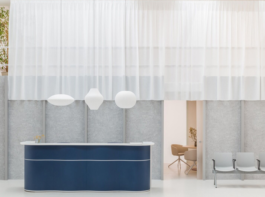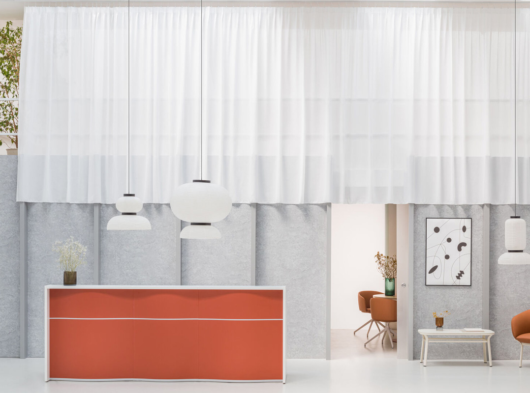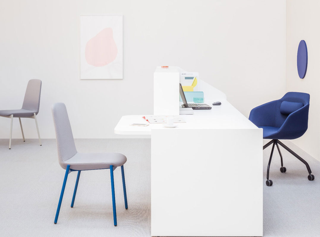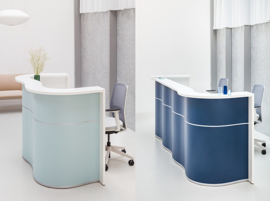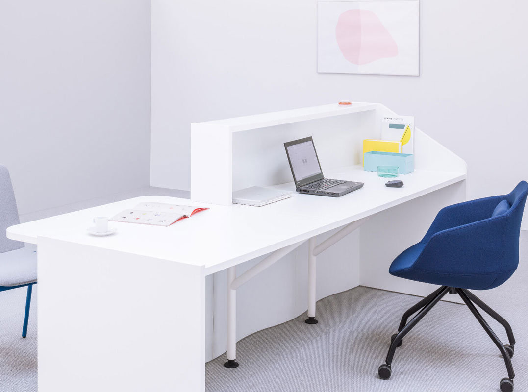 Modular construction allows creating customized configurations. Snail shaped reception helps to save space and at the same time provides functionality. An extended version of the desk can be made of several workstations. The low module with overhang top is a convenience for disabled customers.