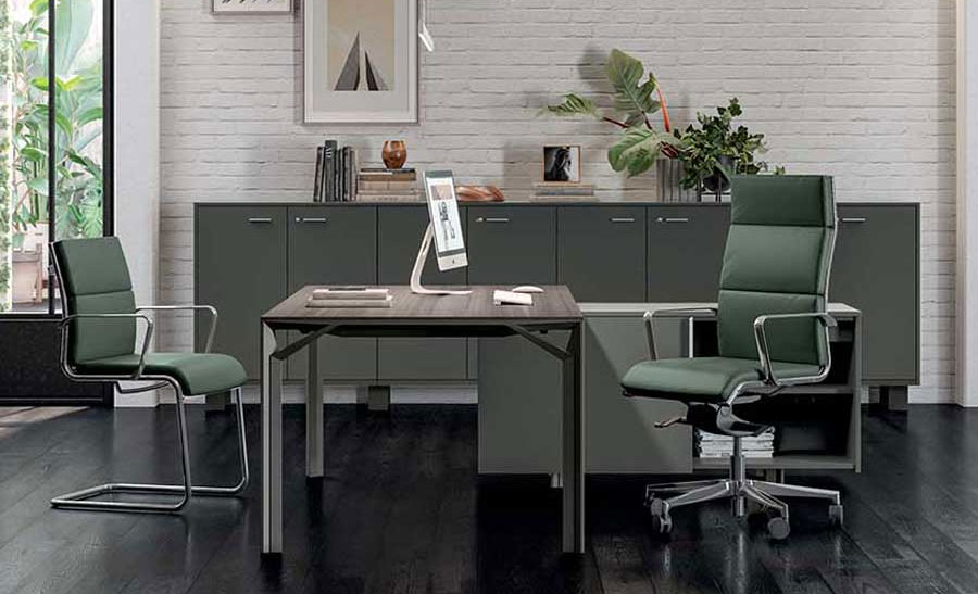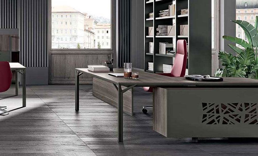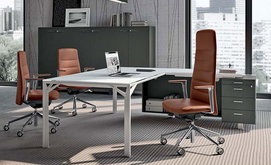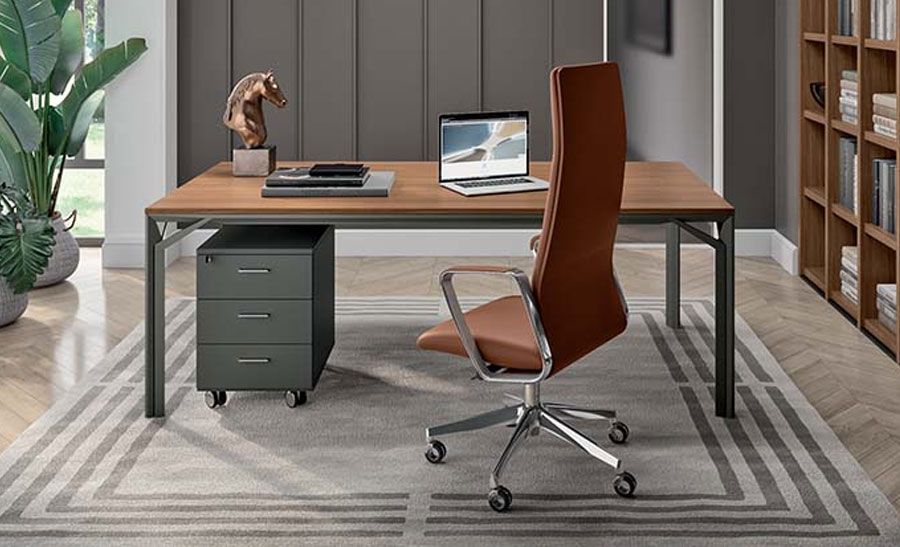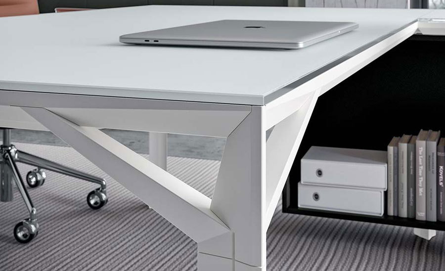 The desktop design is inspired to ensure tidiness and practicality, thanks to functional accessories, like the cable tidy trays. The desk can be enriched with a container module for storing personal belongings or filing documentation. The executive version with writing desk creates an L shape, which is practical for work and welcoming guests and partners.